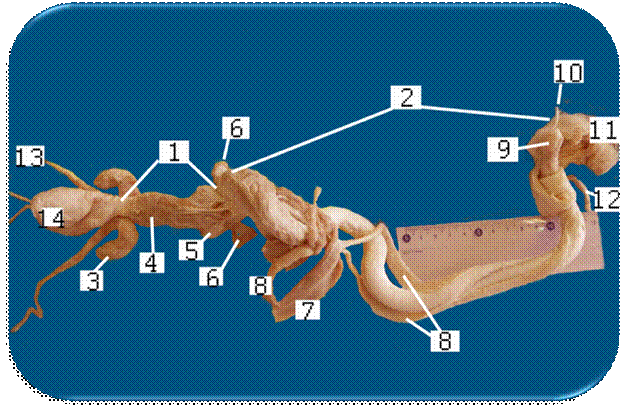 часть мочеполового канала, корень и тело полового члена; 3 – пузырьковидные